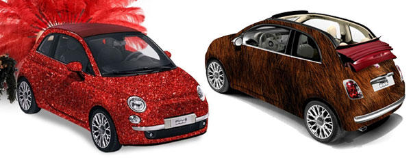 Fiat 500 Drag: customizado con plumas rosas y tela de lycra con lentejuelas.