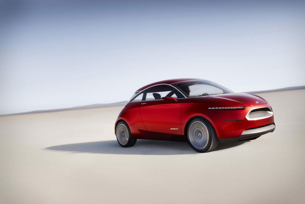 A simple vista, el Start Concept nos recuerda a aquella primera generación del Ford Ka, con una silueta muy redondeada y las ruedas situadas muy cerca de los extremos para garantizar el máximo de habitabilidad. La estructura del prototipo ha sido realizada en aluminio y acero, que consiguen una alta resistencia con un peso muy contenido. Todos los elementos de la carrocería están realizados en fibras composite, totalmente reciclables. El diseño es muy minimalista, con una parrilla minúscula y una línea de diodos LED que sustituye a los faros tradicionales.