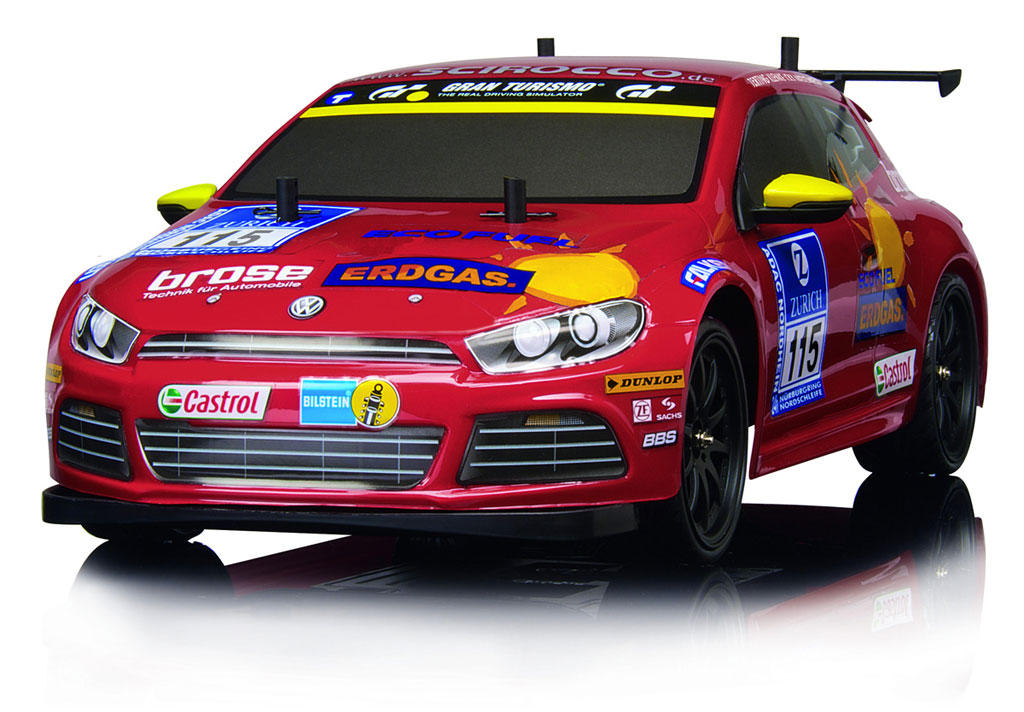 Los amantes de los coches teledirigidos tienen ahora a su alcance una réplica del Volkswagen Scirocco GT24 CNG, un modelo que disputó con éxito las dos últimas ediciones de la prestigiosa y exigente prueba de resistencia de las 24 horas de Nürburgring. El nuevo Scirocco GT24 CNG RC está fabricado a escala 1:10 y tiene una longitud de unos 40 cm. El vehículo viene acompañado de un radiotelemando de dos canales, y cuenta con una función completa de marcha hacia adelante, atrás, derecha e izquierda. El conjunto de suministro incluye además una batería de motor de 9,6 V con cargador y una batería monobloc de 9 V.