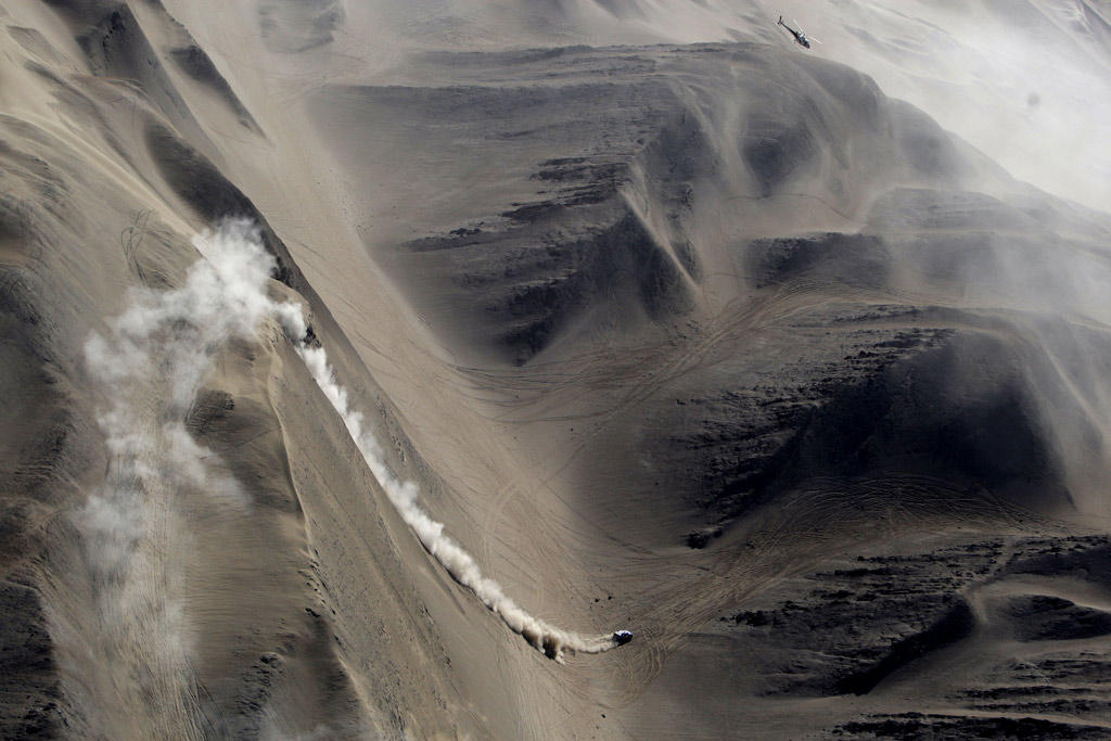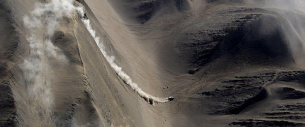 La estela del coche deja ver el avance por una repisa, al borde de un barranco impresionante, y la bajada de vértigo a tope para tomar impulso y subir la otra ladera del valle; las huellas muestran el paso de quienes precedieron buscando solución al inmenso laberinto de dunas… ¿Cuál de ellos dio con el mejor paso? Es la historia de cada día en el Dakar.