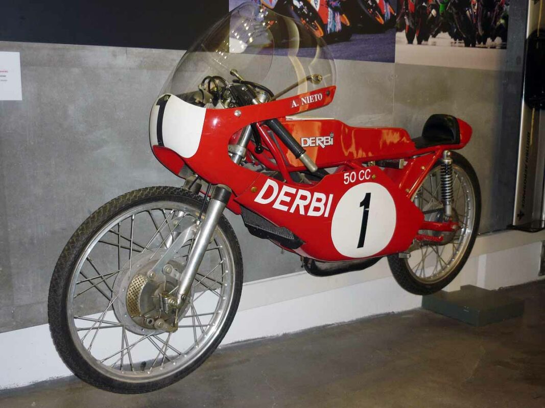 Una de ellas es la Derbi con la que Ángel Nieto lograra su primer Campeonato del Mundo de Velocidad allá por 1969, en la categoría de 50 cc; fue el primer Mundial logrado por un piloto español y que abriría la veda a las conquistas que hoy conocemos.