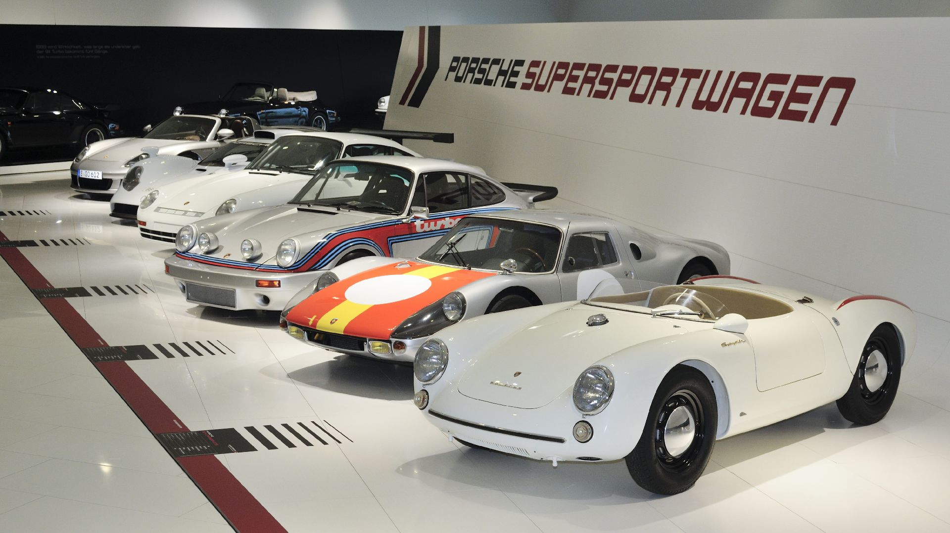 Entre los vehículos que se exhiben hay algunos modelos que nunca antes se habían presentado al público. Por ejemplo, será posible admirar el primer 550 Spyder de la historia, que va a ser comprado por un cliente particular, un coche que se le asignó al piloto Kurt Ahrens en enero de 1955. Hoy en día el propulsor que equipa al 550 Spyder es tan legendario como el propio vehículo, y se ha llegado a conocer como «motor Fuhrmann «. Esta mecánica plana de cuatro cilindros, con cuatro árboles de levas en cabeza, está considerada una de las más exitosas de todos los tiempos para Porsche y también se destaca en la exposición.