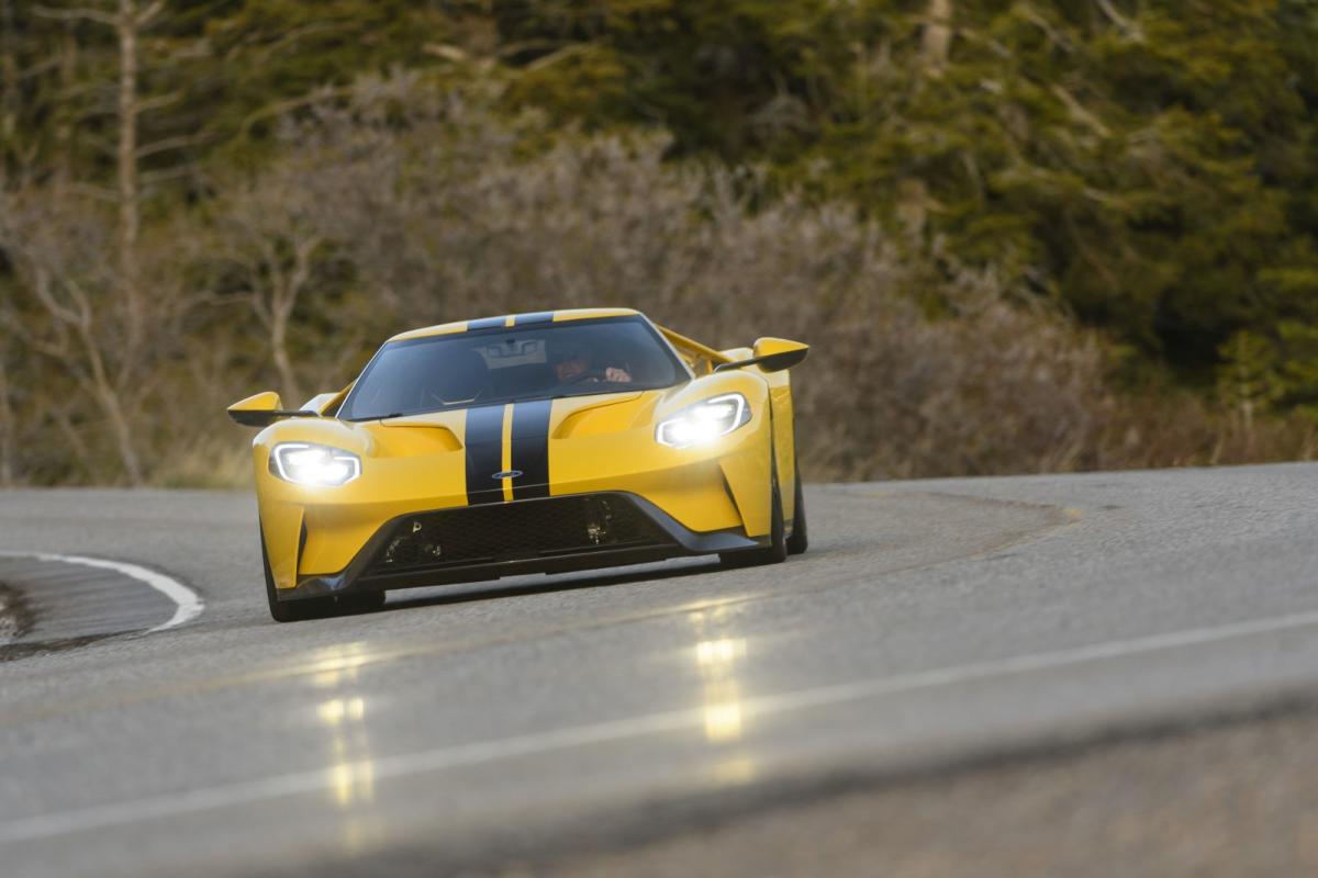 El nuevo modelo es tan impresionante como su aspecto sugiere. Está fabricado en fibra de carbono prácticamente en su totalidad, comenzando por el monocasco (al que se acoplan dos subchasis de aluminio; uno por delante y otro por detrás) y terminado por la carrocería al completo o, incluso, las llantas, esto último en opción. Y, respecto a su motorización, a pesar de su apariencia, y a pesar también de la tendencia de la competencia, el Ford GT no es un superdeportivo híbrido, sino que emplea un motor 3.5 V6 EcoBoost de gasolina que, asistido por dos turbocompresores, desarrolla 656 CV de potencia a 6.250 rpm y 745 Nm de par a 5.900 rpm. Con semejante potencial, y teniendo en cuenta la ligereza del coche (1.385 kg), el Ford GT es un coche ultra rápido, con una aceleración de 0 a 100 km/h en menos de 3 segundos y una velocidad máxima de 347 km/h en su modo de conducción V-Max, que coloca la aerodinámica activa en la posición óptima para alcanzar la máxima velocidad posible.