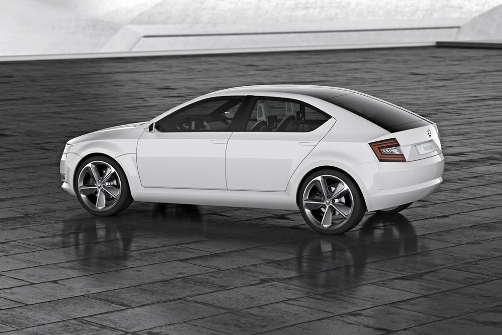 Si volvemos al prototipo, vemos cómo el VisionD utiliza recursos típicos de la marca checa, como el capó esculpido, aunque sobre esa base se ha realizado un trabajo muy interesante para dotarlo de mayor personalidad. Las líneas son más fluidas para conseguir un aspecto más deportivo, a lo que contribuyen también los cortos voladizos y el amplio portón del maletero. La parrilla, aunque mantiene las líneas básicas de la actual, se moderniza con formas más angulosas y deja un espacio en la parte superior para integrar el nuevo logo.