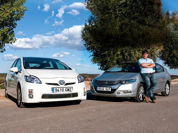 | Al detalle | El Prius combina un motor 1.8 de gasolina de 99 CV con otro eléctrico de 82 CV: su potencia conjunta es de 136 CV. Este modelo se ofrece con tres acabados; el básico Eco -23.360e-, el intermedio Advance -24.960 -, el más recomendable- y el lujoso Executive de esta prueba. En todos los casos el cambio es automático y la tracción delantera. Antes de este Prius hubo otros dos en 1997 y 2004. | El Insight combina un motor 1.3 gasolina de 88 CV con un propulsor eléctrico de 14 CV -en conjunto rinden 98 CV-. Como en el Toyota, hay tres acabados: Elegance -19.800e-, Executive -por 20.800e y el más recomendable- y Executive Nav -por 23.200E; es como el anterior pero con navegador-. Todos los Insight son automáticos. |