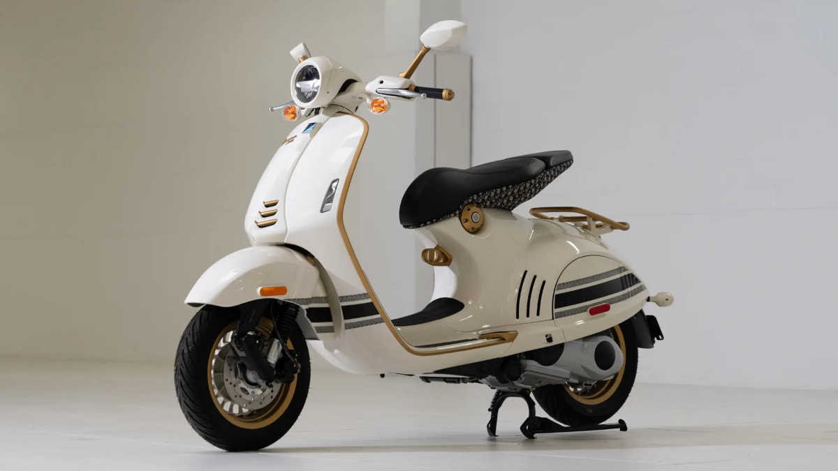 Con la ayuda de María Grazia Chiuri, directora creativa de las colecciones femeninas de Dior, esta Vespa 946 luce detalles dorados y el conocido logo de la marca gala. A esto, se suma un baúl extraíble y un casco con los motivos de la popular firma de moda. Este motivo sigue en ciertas partes del asiento. El resto del diseño se completa con unos carenados acabados en un color blanco perla para crear el efecto de contraste perfecto.